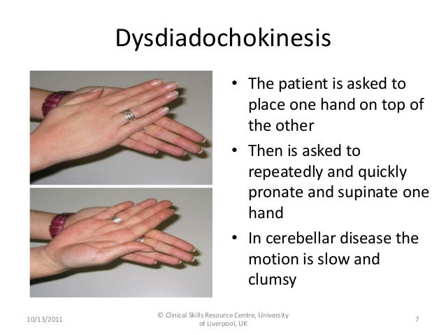 - Further Evaluation: If dysdiadochokinesis is observed, further neurological evaluation may be warranted to identify the underlying cause and assess for additional cerebellar signs.